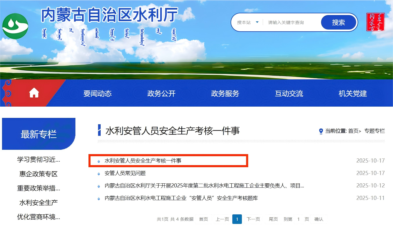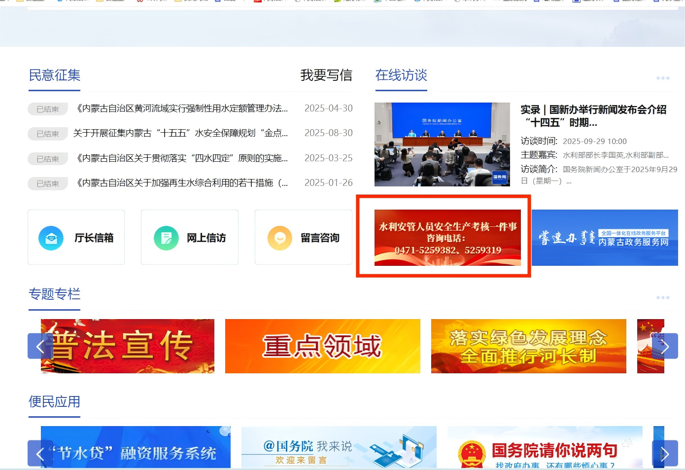 2.在自治区水利厅官网点击“水利安管人员考核一件事”专栏。(如图1-1)