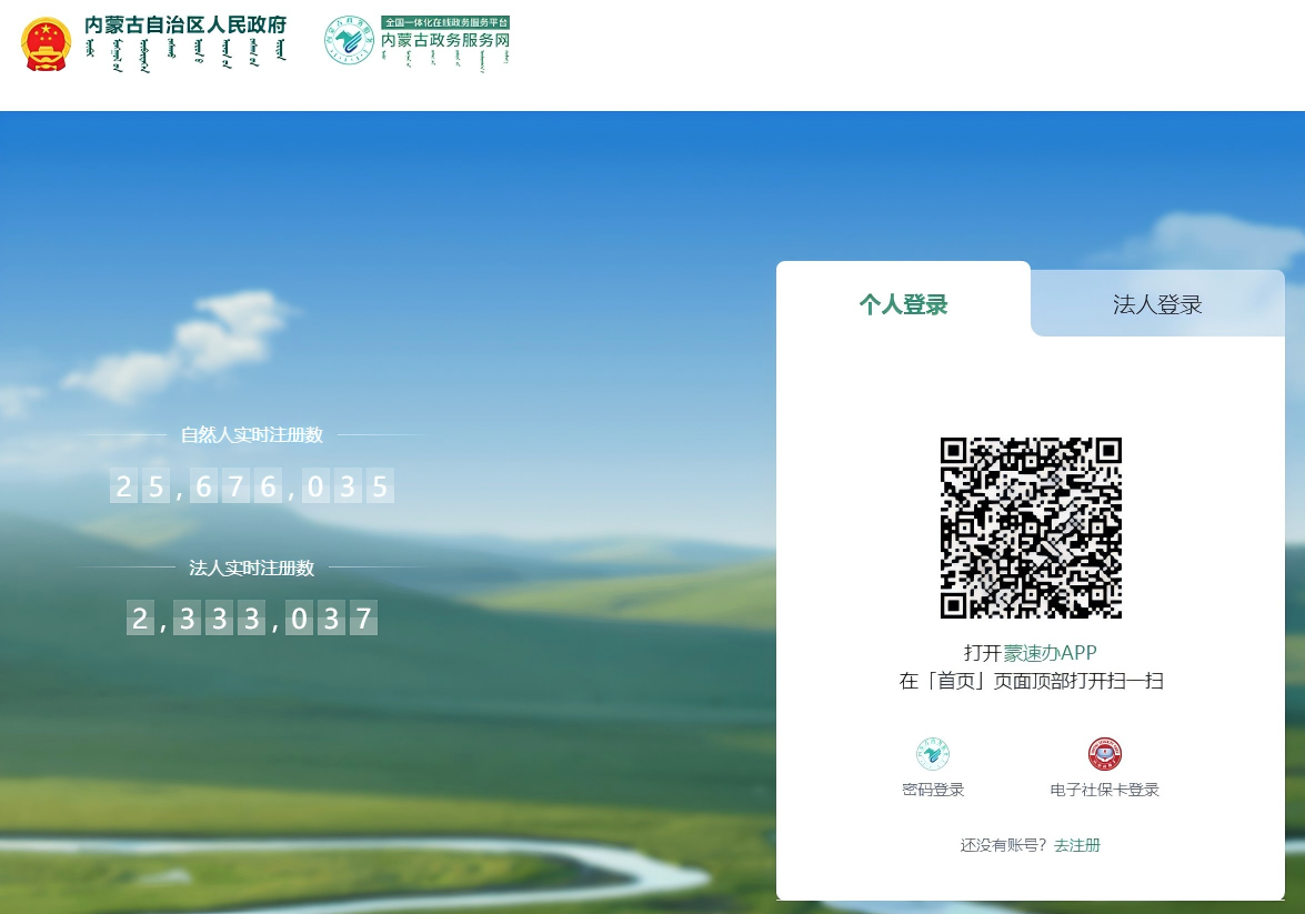 4.选择“个人登录”,使用“蒙速办”APP扫码登录,如未注册内蒙古政务服务网账号,请先进行注册。(如图1-3)