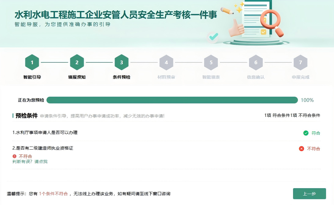 4.以报考“项目负责人”举例,需阅读勾选填报需知,了解报考条件。系统将自动进行条件预检,如果您没有取得二级建造师执业资格证,无法进行下一步报考。(如图2-4)