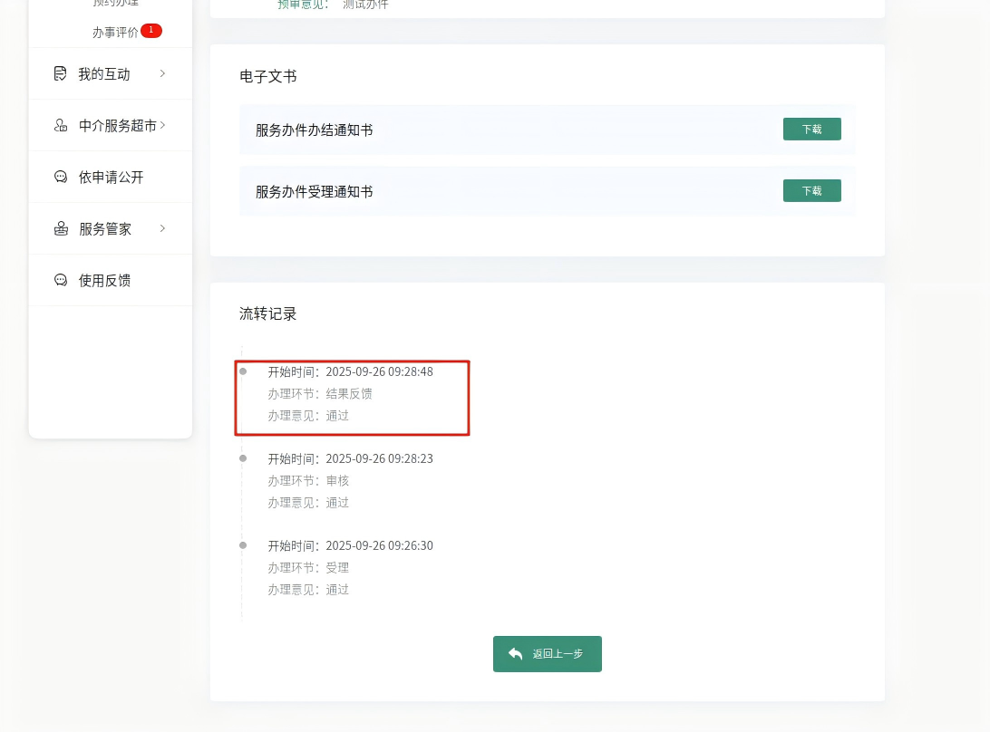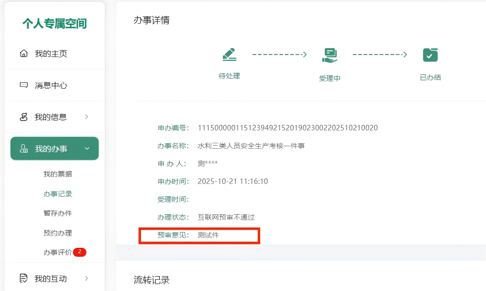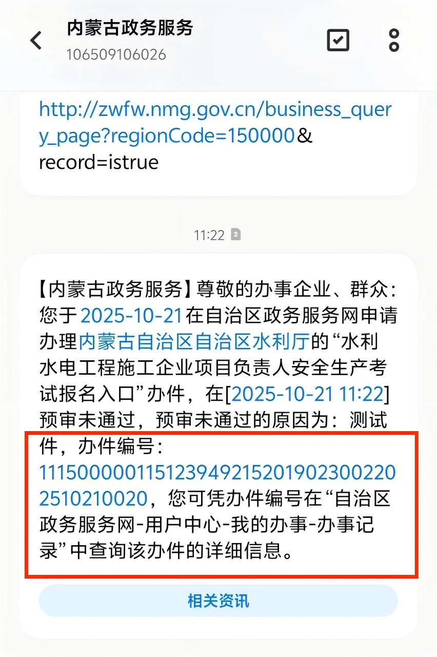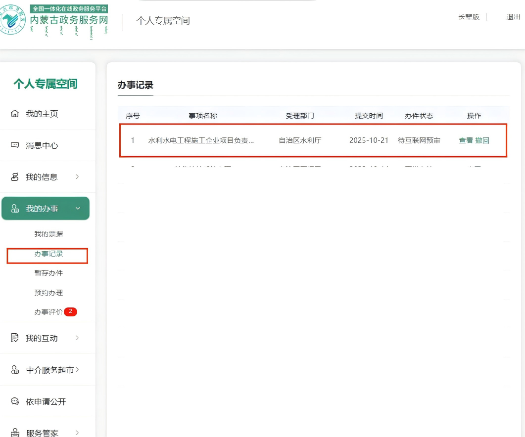 8.如果您的办件在预审或受理阶段被退回,您可以登录电脑端内蒙古政务服务网,在个人专属空间—办事记录查看退回理由,或者查看手机短信提醒(或者电话咨询0471-5259382),可按要求重新上传资料再次提交申请。(如图2-9、图2-10)
