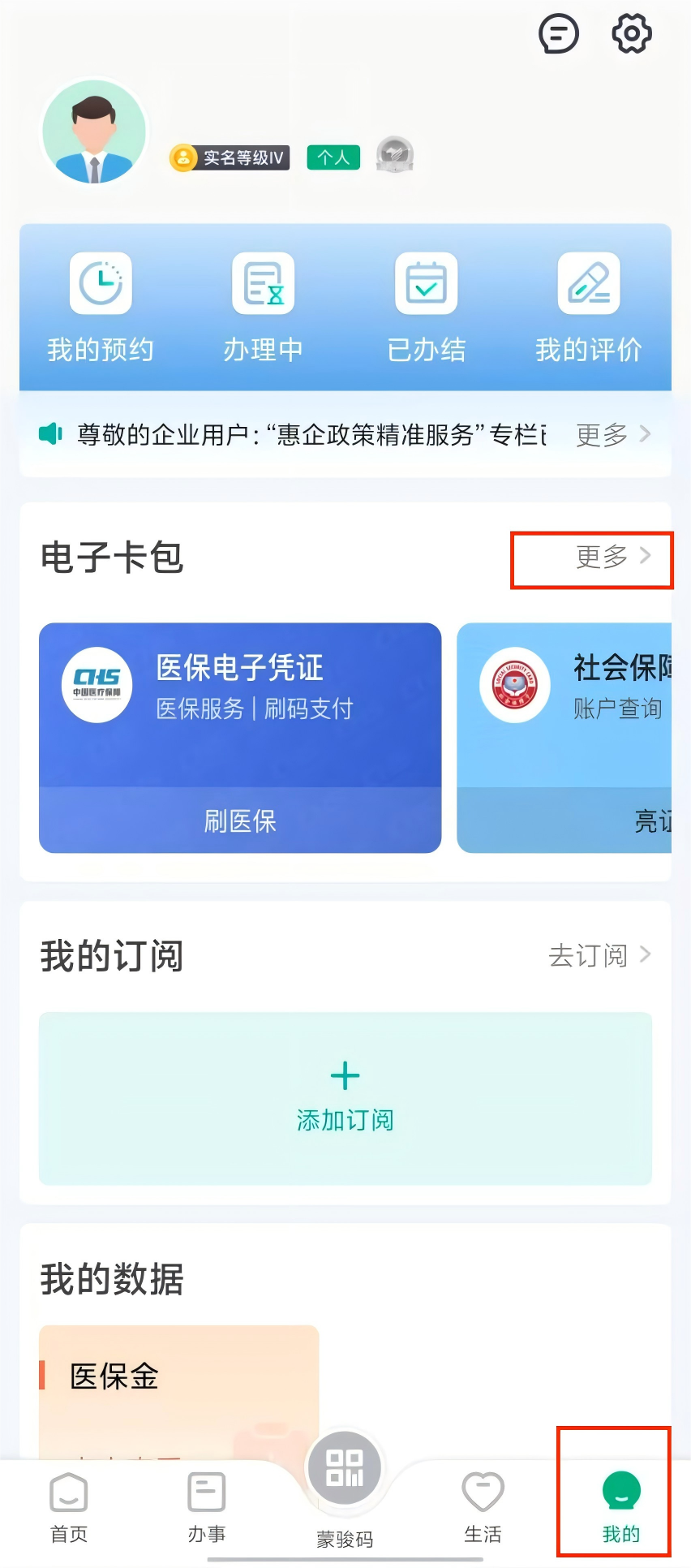 考试结束后,自治区水利厅对考试合格人员进行公示,公示期为5个工作日。公示结束10个工作日内,安全生产考核合格证书将自动推送至考生个人蒙速办。考生可在“蒙速办”APP“我的”—“电子卡包”—点击“更多”选项,查看证照。(如图4-1)