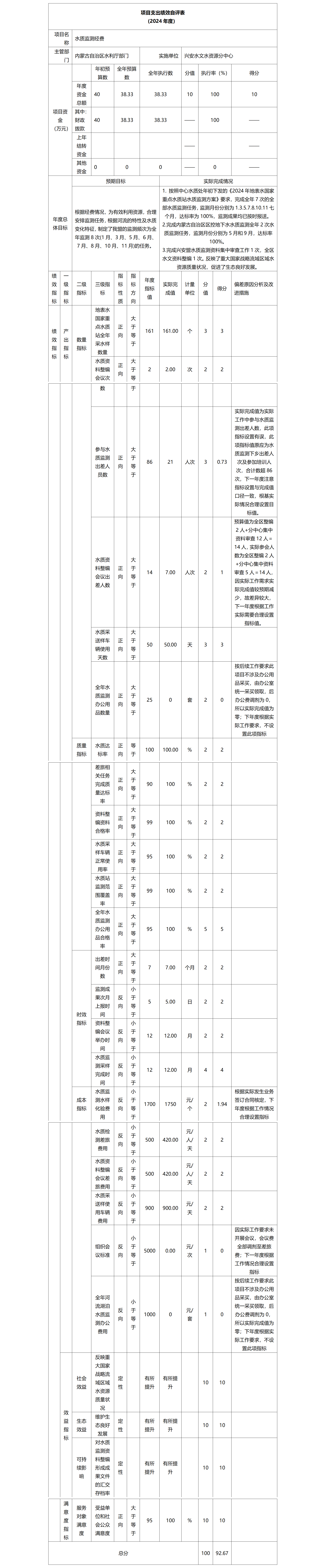 4.水质监测经费项目自评综述:根据年初设定的绩效目标,项目自评得分92.67分。全年预算数为38.33万元,执行数为38.33万元,完成预算的100%。项目绩效目标完成情况:(1)按照中心水质处年初下发的《2024年地表水国家重点水质站水质监测方案》要求,完成全年7次的全部水质监测任务,监测月份分别为1.3.5.7.8.10.11七个月,达标率为100%,监测成果均已按时报送;(2)完成内蒙古自治区区控地下水水质监测全年2次水质监测任务,监测月份分别为5月和9月,达标率100%;(3)完成兴安盟水质监测资料集中审查工作1次,全区水文资料整编1次。反映了重大国家战略流域区域水资源质量状况,促进了生态良好发展。