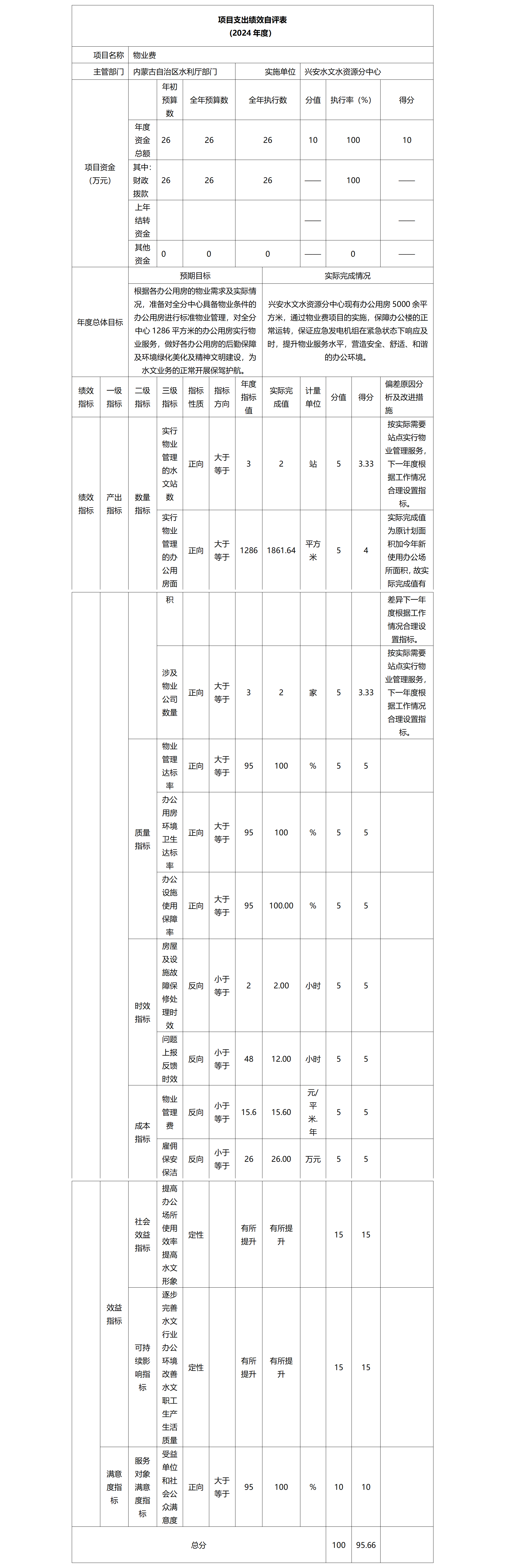 5.物业费项目自评综述:根据年初设定的绩效目标,项目自评得分95.66分。全年预算数为26.00万元,执行数为26.00万元,完成预算的100%。项目绩效目标完成情况:兴安水文水资源分中心现有办公用房5000余平方米,通过物业费项目的实施,保障办公楼的正常运转,保证应急发电机组在紧急状态下响应及时,提升物业服务水平,营造安全、舒适、和谐的办公环境。