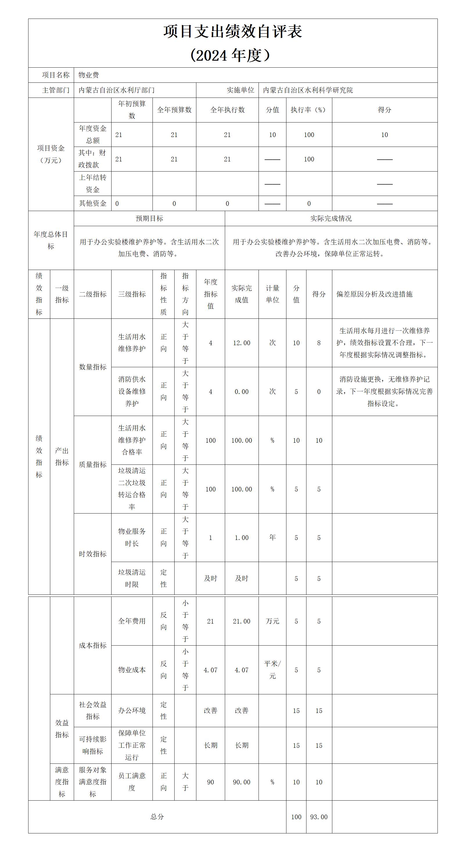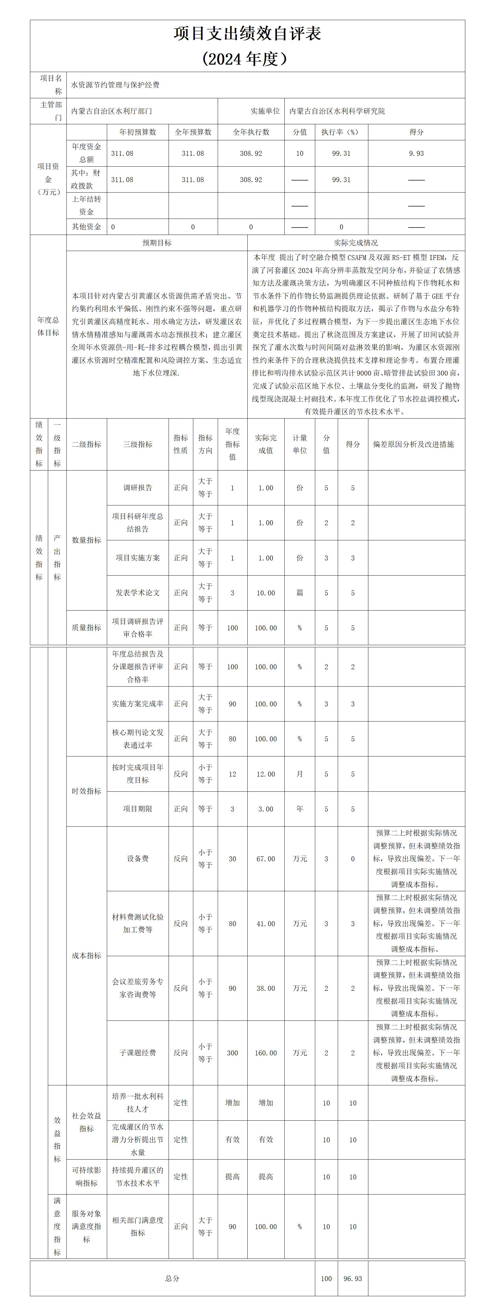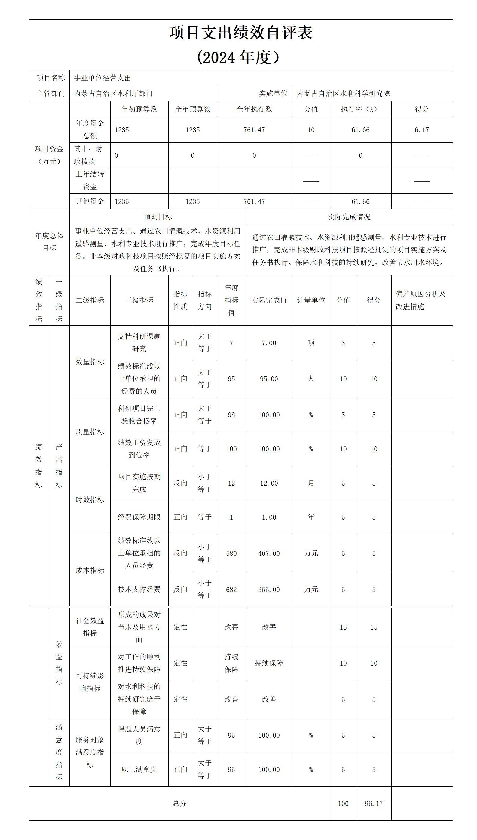 2024年度我院在年度工作目标计划及执行情况上严格执行年初预算目标,坚持以党的二十大、二十届二中、三中全会精神为指导,深入学习贯彻习近平总书记“节水优先、空间均衡、系统治理、两手发力”治水思路和关于治水的重要论述,坚持铸牢中华民族共同体意识为工作主线,紧紧围绕自治区“贯穿一条主线、办好两件大事,弘扬蒙古马精神,闯新路、进中游”的工作大局,全面深化科技体制机制改革,集中资源力量推进水利科技创新,水利各项工作取得新突破。