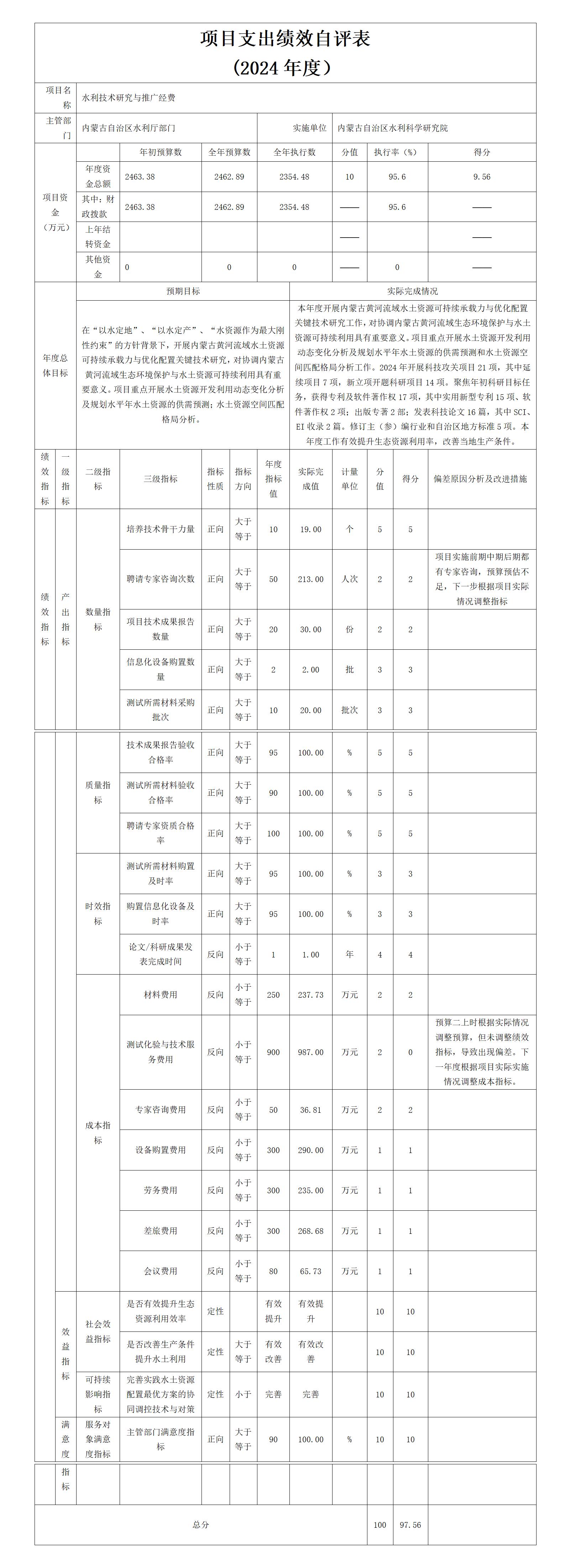 3、水利技术研究与推广经费项目自评综述:根据年初设定的绩效目标,项目自评得分97.56分。全年预算数为2462.89万元,执行数为2354.48万元,完成预算的95.60%。