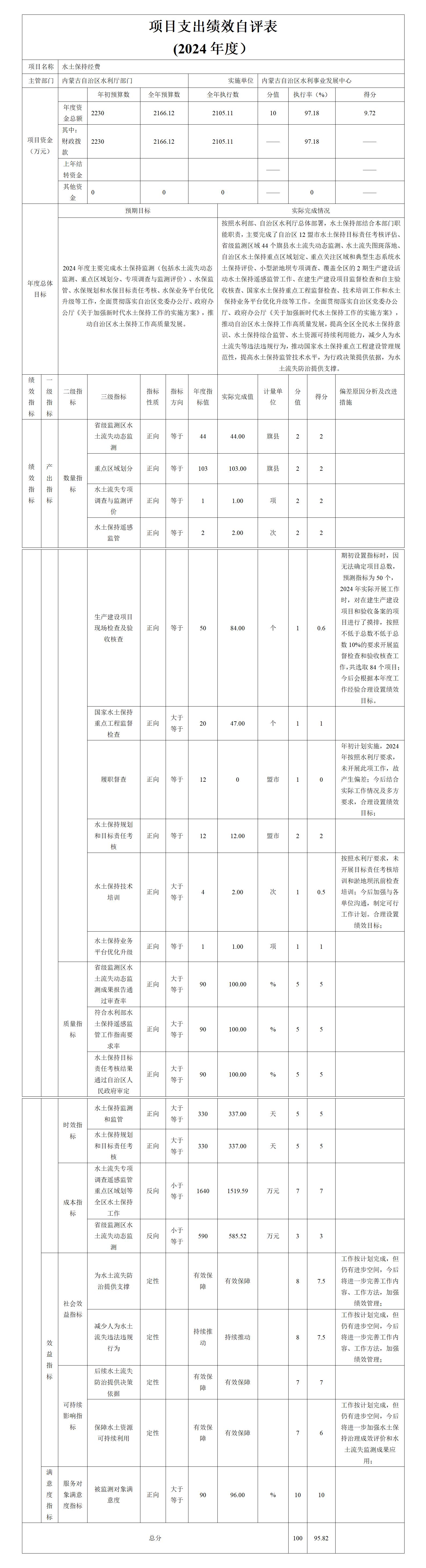 1.水土保持经费项目自评综述:根据年初设定的绩效目标,项目自评得分95.82分。全年预算数2,166.12万元,执行数为2,105.11万元,完成预算的97.18%。项目绩效目标完成情况:按照水利部、自治区水利厅总体部署,2024年水土保持部结合本部门职能职责,主要完成了自治区12盟市水土保持目标责任考核评估、省级监测区域44个旗县水土流失动态监测、水土流失图斑落地、自治区水土保持重点区域划定、重点关注区域和典型生态系统水土保持评价、小型淤地坝专项调查、覆盖全区的2期生产建设活动水土保持遥感监管工作、在建生产建设项目监督检查和自主验收核查、国家水土保持重点工程监督检查、技术培训工作和水土保持业务平台优化升级等工作。全面贯彻落实自治区党委办公厅、政府办公厅《关于加强新时代水土保持工作的实施方案》,推动自治区水土保持工作高质量发展,提高全区全民水土保持意识、水土保持综合监管、水土资源可持续利用能力,减少人为水土流失等违法违规行为,推动国家水土保持重点工程建设管理规范性,提高水土保持监管技术水平,为行政决策提供依据,为水土流失防治提供支撑。发现的问题及原因:履职督查未完成,按照水利厅要求,未开展此项工作;水土保持技术培训未完成值:按照水利厅要求,未开展目标责任考核培训和淤地坝汛前检查培训。下一步改进措施:(1)加强培训,提升预算管理能力。(2)进一步加强成效评价和成果应用工作,提升水土保持效益的发挥,保障水土资源可持续利用。(3)加强日常绩效自评资料的收集整理,确保相关信息完整、可靠。(4)加强绩效运行监控工作,密切关注目标任务开展情况,确保实际工作切合绩效目标。