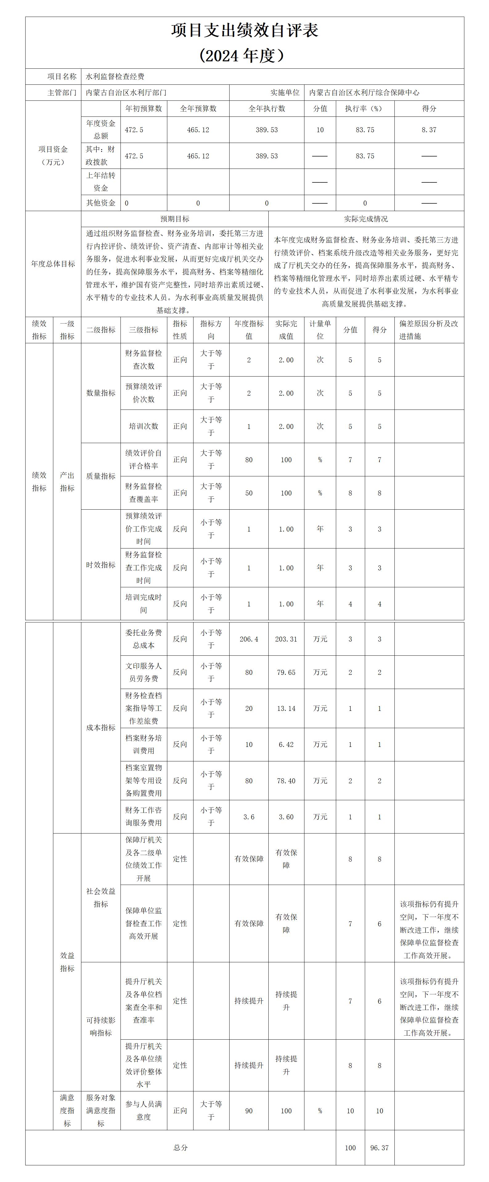 2.水利监督检查经费项目自评综述:根据年初设定的绩效目标,项目自评得分96.37分。全年预算数为465.12万元,执行数为389.53万元,完成预算的83.75%。项目绩效目标完成情况:本年度完成财务监督检查、财务业务培训、委托第三方进行绩效评价、档案系统升级改造等相关业务服务,更好完成了厅机关交办的任务,提高保障服务水平,提高财务、档案等精细化管理水平,同时培养出素质过硬、水平精专的专业技术人员,从而促进了水利事业发展,为水利事业高质量发展提供基础支撑。发现的主要问题及原因:档案室升级改造项目因自治区档案局2024年9月份批复同意,导致内蒙古自治区水利厅数字档案室建设、内蒙古自治区水利厅档案管理系统建设项目签订合同时间较晚,项目实施时间晚年底未完成。改进措施:督促业务科室加快工作进度,已于2025年6月前完成项目。