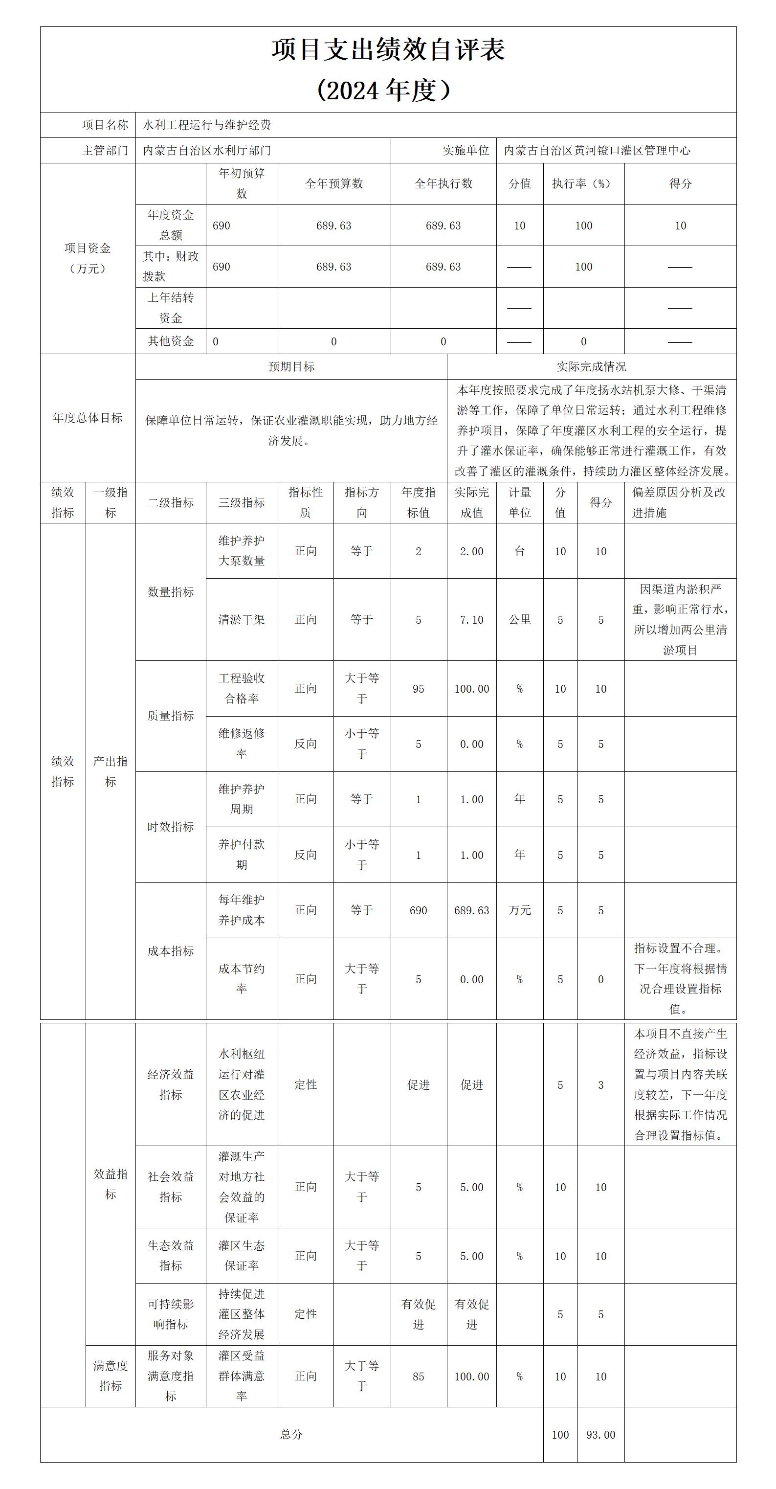 3.水利工程运行与维护项目自评综述:根据年初设定的绩效目标,项目自评得分93分。全年预算数为690万元,执行数为689.63万元,完成预算的99.95%。项目绩效目标完成情况:本年度按照要求完成了年度扬水站机泵大修、干渠清淤等工作,保障了单位日常运转;通过水利工程维修养护项目,保障了年度灌区水利工程的安全运行,提升了灌水保证率,确保能够正常进行灌溉工作,有效改善了灌区的灌溉条件,持续助力灌区整体经济发展。发现的主要问题及原因:本项目绩效指标设置不合理,部分指标年度指标值设置不符合实际情况,导致部分指标的实际完成情况与预期存在偏差。下一步改进措施:落实巡查责任,精细维养计划。积极开展日常巡查,尤其灌溉运行期间,一旦发现工程及设备缺陷或隐患及时采取措施整改,努力避免缺陷扩大和带病工作,确保运行安全,并认真做好各项记录,对存在的问题建立台账,作为纳入年度维修养护计划的依据。对年度维修养护计划内容要实地调研,对存在问题提出具体改进措施,制定工程量清单,形成详细科学可行的实施方案,确保年度维修养护项目顺利实施。