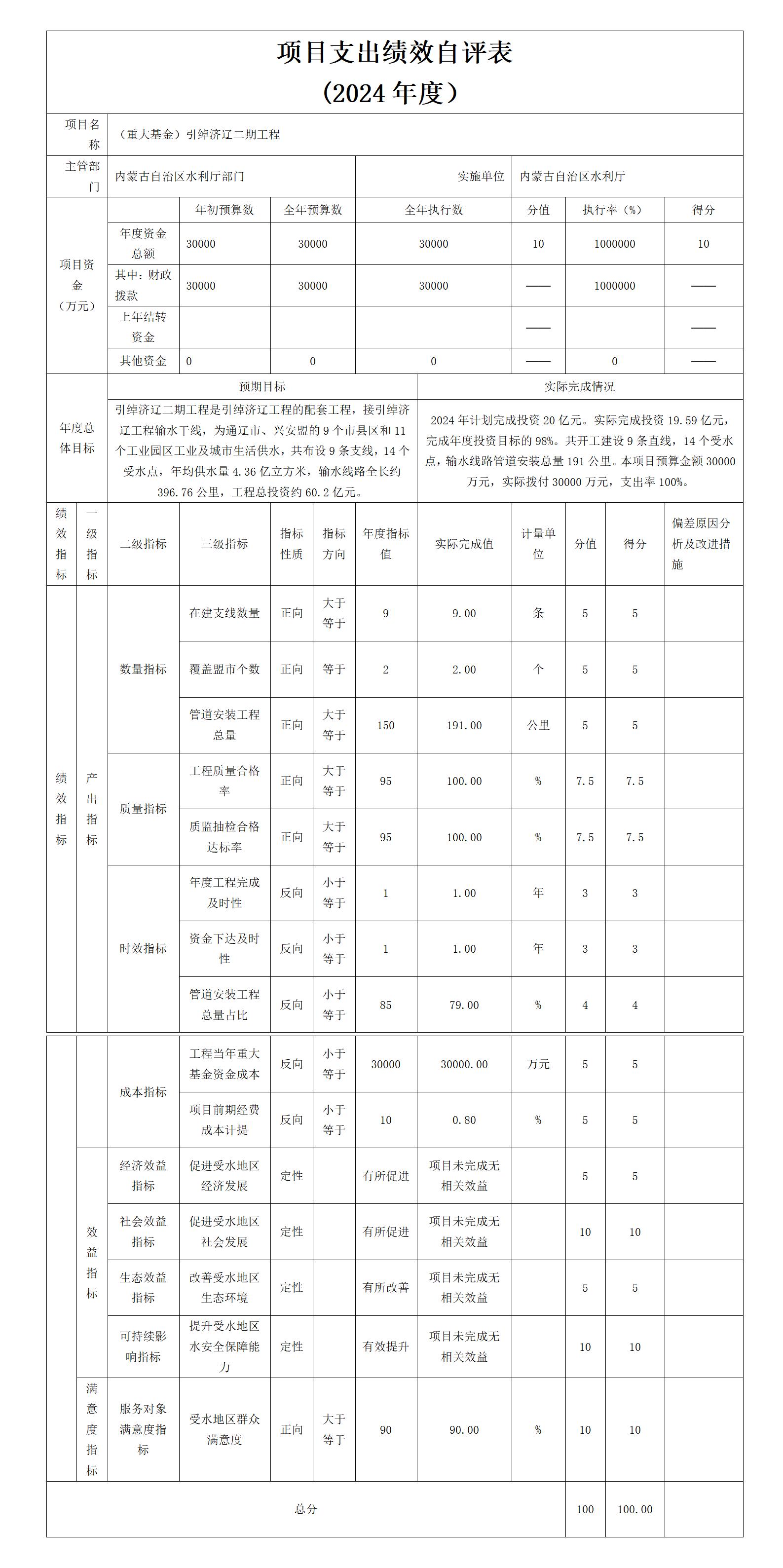 4.(重大基金)引绰济辽二期工程项目绩效评价自评报告项目自评综述:根据年初设定的绩效目标,项目自评得分100分。全年预算数为30,000.00万元,执行数为30,000.00万元,完成预算的100%。项目绩效目标完成情况:2024年计划完成工程总投资20亿元。实际完成投资19.59亿元,完成年度投资目标的98%。共开工建设9条直线,14个受水点,输水线路管道安装总量191公里。本项目预算金额30,000.00万元,实际拨付30,000.00万元,支出率100%。发现的主要问题及原因:无。下一步改进措施:无。