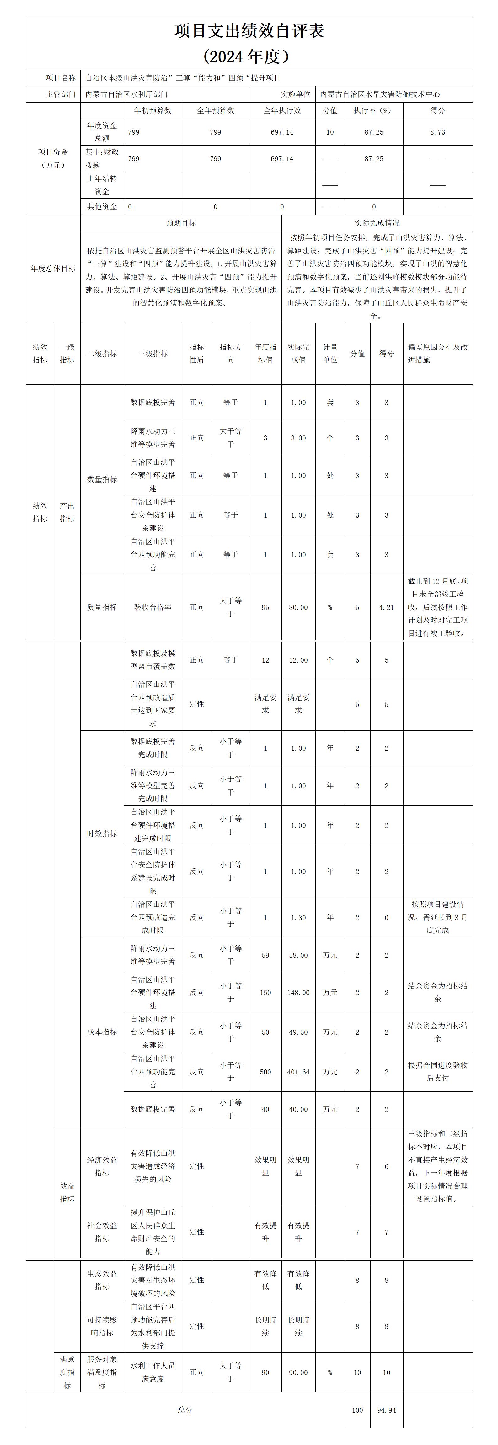 5.自治区本级山洪灾害防治“三算”能力和“四预”提升项目自评综述:根据年初设定的绩效目标,项目自评得分94.94分。全年预算数为799.00万元,执行数为497.14万元,完成预算的87.25%。项目绩效目标完成情况:按照年初项目任务安排,完成了山洪灾害算力、算法、算距建设;完成了山洪灾害“四预”能力提升建设;完善了山洪灾害防治四预功能模块,实现了山洪的智慧化预演和数字化预案,当前还剩洪峰模数模块部分功能待完善。本项目有效减少了山洪灾害带来的损失,提升了山洪灾害防治能力,保障了山丘区人民群众生命财产安全。发现的主要问题及原因:本年实施方案批复时间较长,开工时间较晚,为保证项目质量,适当延长实施期限,导致本年度绩效目标未全部完成。下一步改进措施在项目预算编制过程中,在参照以往工作的经验上,充分考察调研,争取项目预算编制做到重点突出、内容真实、理由充分、资金安排合理、有依有据。编制绩效目标要精准、全面、有效、合理;绩效目标评价,坚持科学规范、公平公正、绩效相关的原则,认真评价绩效目标的设定情况,资金的投入产出情况,及绩效目标的实现程度及效果。